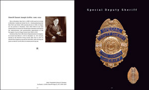The badges presented a problem, however, since the collector had very little information available on them. Short of putting 50 stock photos of someone wearing a badge on the page opposite, we had to start getting creative. After looking through the badges we realized that many of them had individuals or locations named on them and others were specialty badges such as Registered Chauffeur, National Horse Thief Detective Association (NHTDA) and 1900 Census Taker.